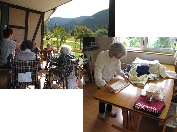 毎日フロアに集まって、体操や個々にレクリエーションなど行っています。お掃除や洗濯物たたみなど日常のできるお手伝いもしていただきます。