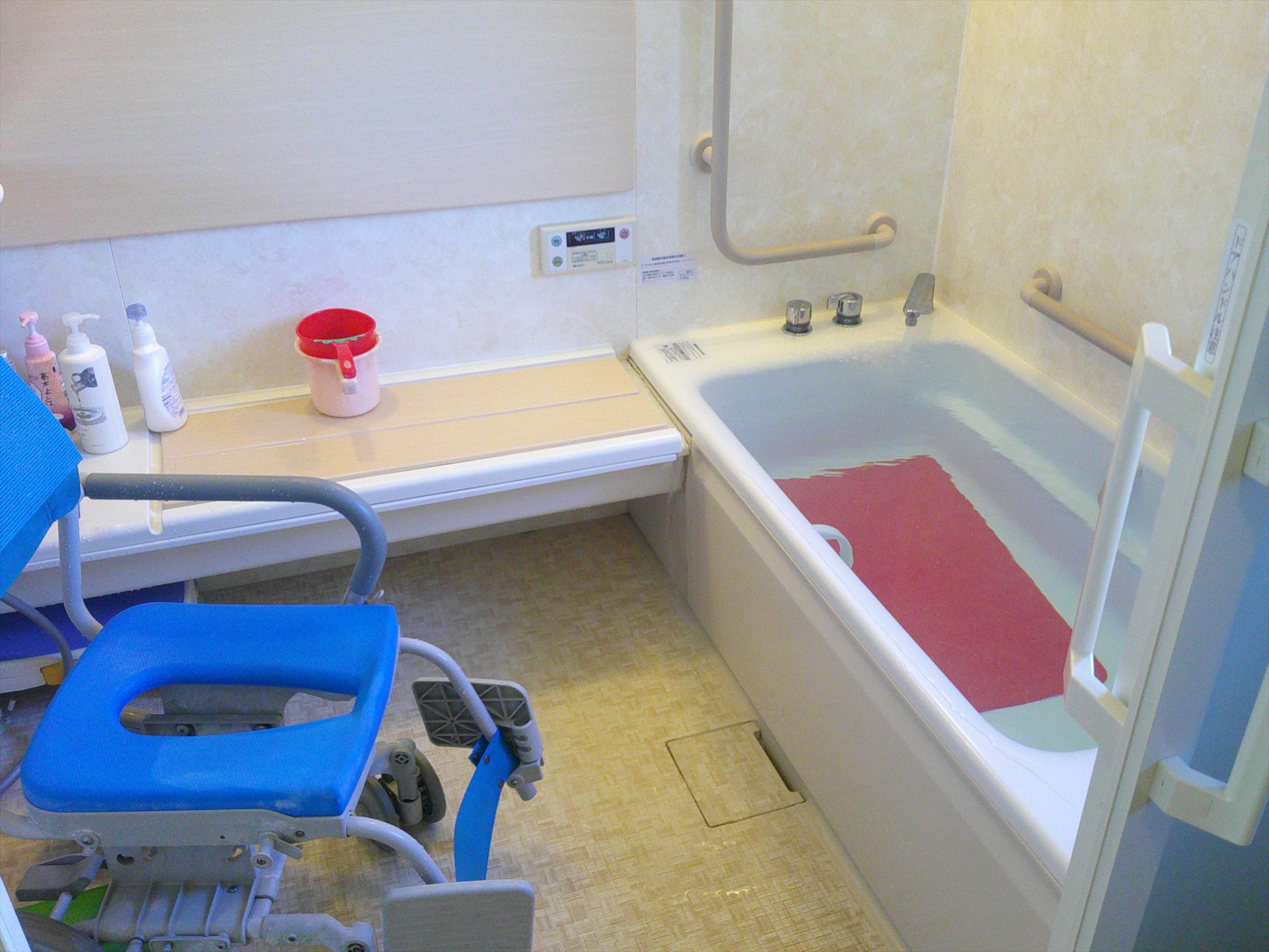 自立支援用家庭風呂で、お一人ずつゆっくりと入浴を楽しむことができます。障害があってもスタッフの介助で湯船にも入れます。